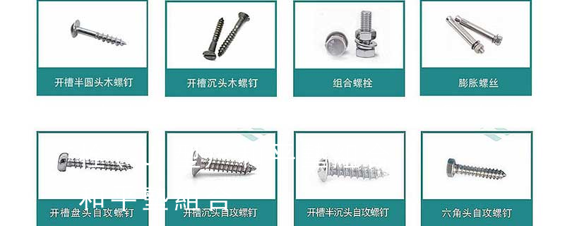 螺栓類:外六角螺栓、外六角法蘭面螺栓、內六角圓柱頭螺栓、吊環螺栓、膨脹螺栓、沉頭內六角螺栓、盤頭內六角螺絲、馬車螺栓、雙頭螺栓、蝶型螺絲、活節螺栓、地腳螺 栓、U型螺栓、四角螺栓等 螺帽類:鉚螺母、吊環螺母、六