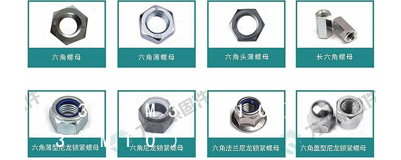 六角厚螺母 GB 56-88 蝶形螺母 GB 62-88 環形螺母 GB 63-88 組合式蓋形螺母 GB 802-88 球面六角螺母 GB 804-88 扣緊螺母 GB 805-88 滾花高螺母 GB 806-88 滾花薄螺母 GB 807-88 小六角特扁細牙螺母 GB 808