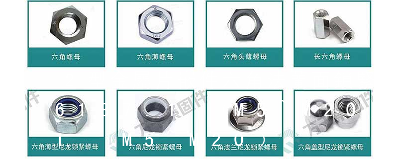 1型六角螺母:標準為GB/T 6170,螺紋規格為M1.6~M64、性能等級為6、8、10、A2-50、A2-70、A4-50、A4-70、CU2、CU3和AL4級、產品等級為A和B級的1型六角螺母。A級用于D≤16mm;B級用于D>16mm的螺母。2型六角 · 側面帶孔圓螺母GB 816-88 · 帶槽圓螺母GB 817-88 · 1型非金屬嵌件六角鎖緊螺母GB /T 889.1-2000 · 1型非金屬嵌件六角鎖緊螺母細牙GB /T 889.2-2000 · 蓋形螺母GB 923-88 · 1型六角螺母GB /T